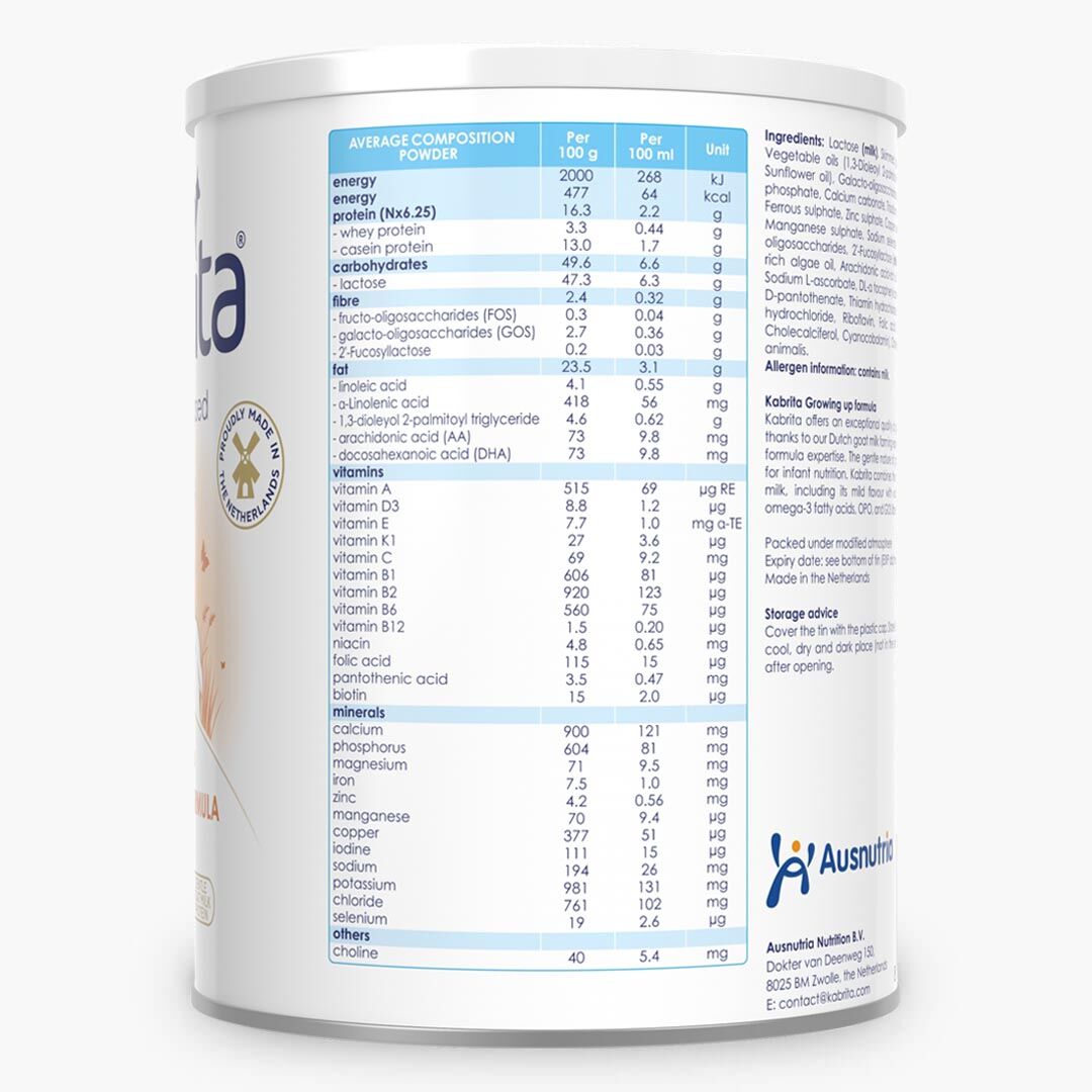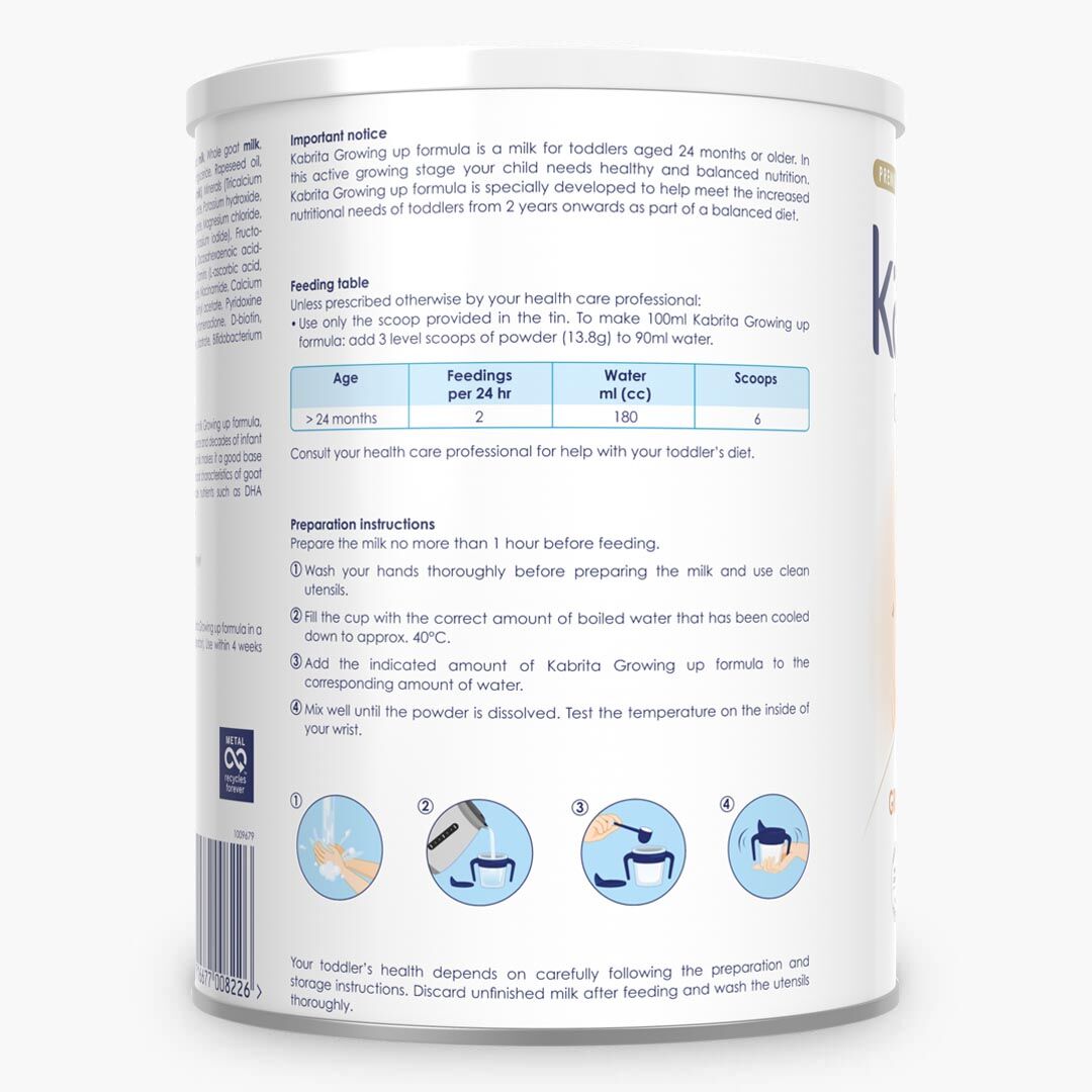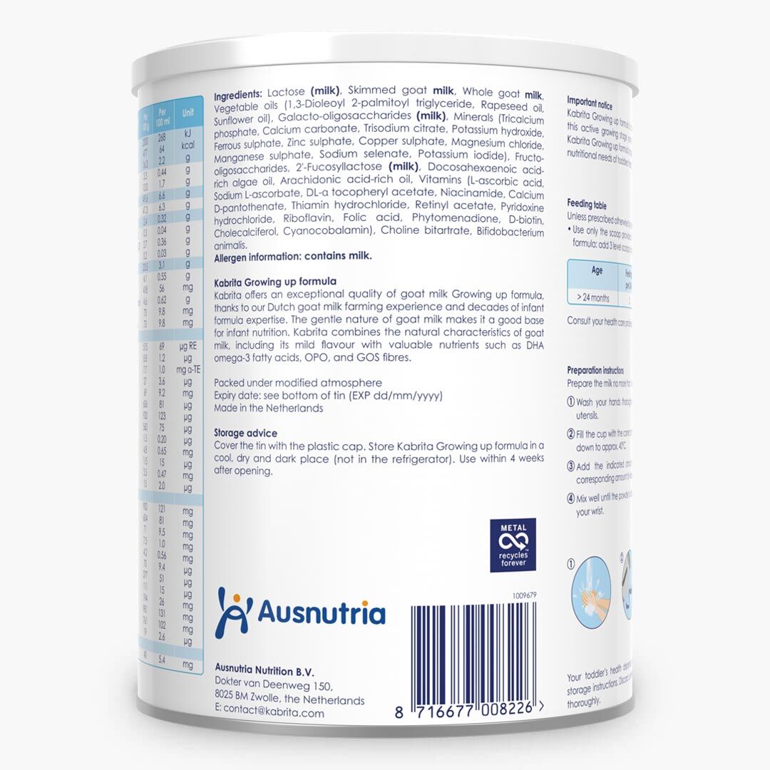 សារធាតុផ្សំ: Lactose (milk), skimmed goat milk, full cream goat milk powder, vegetable oils (coconut oil, rapeseed oil, sunflower oil), 1,3-dioleoyl 2-palmitoyl triglyceride, galacto-oligosaccharides (milk), minerals (tri calcium citrate, tri calcium phosphate, calcium carbonate, magnesium carbonate, tri sodium citrate, ferrous sulphate, zinc sulphate, calcium chloride, magnesium chloride, manganese sulphate, copper sulphate, potassium iodide, sodium selenate), marine oil containing DHA (fish), arachidonic acid-rich oil, choline bitartrate, vitamins (sodium L-ascorbate, L-ascorbic acid, DL-α tocopheryl acetate, niacinamide, calcium D-pantothenate, thiamin hydrochloride, riboflavin, pyridoxine hydrochloride, retinyl acetate, folic acid, phylloquinone, cholecalciferol, D-Biotin, cyanocobalamin), taurine, L-carnitine L-tartrate, inositol.